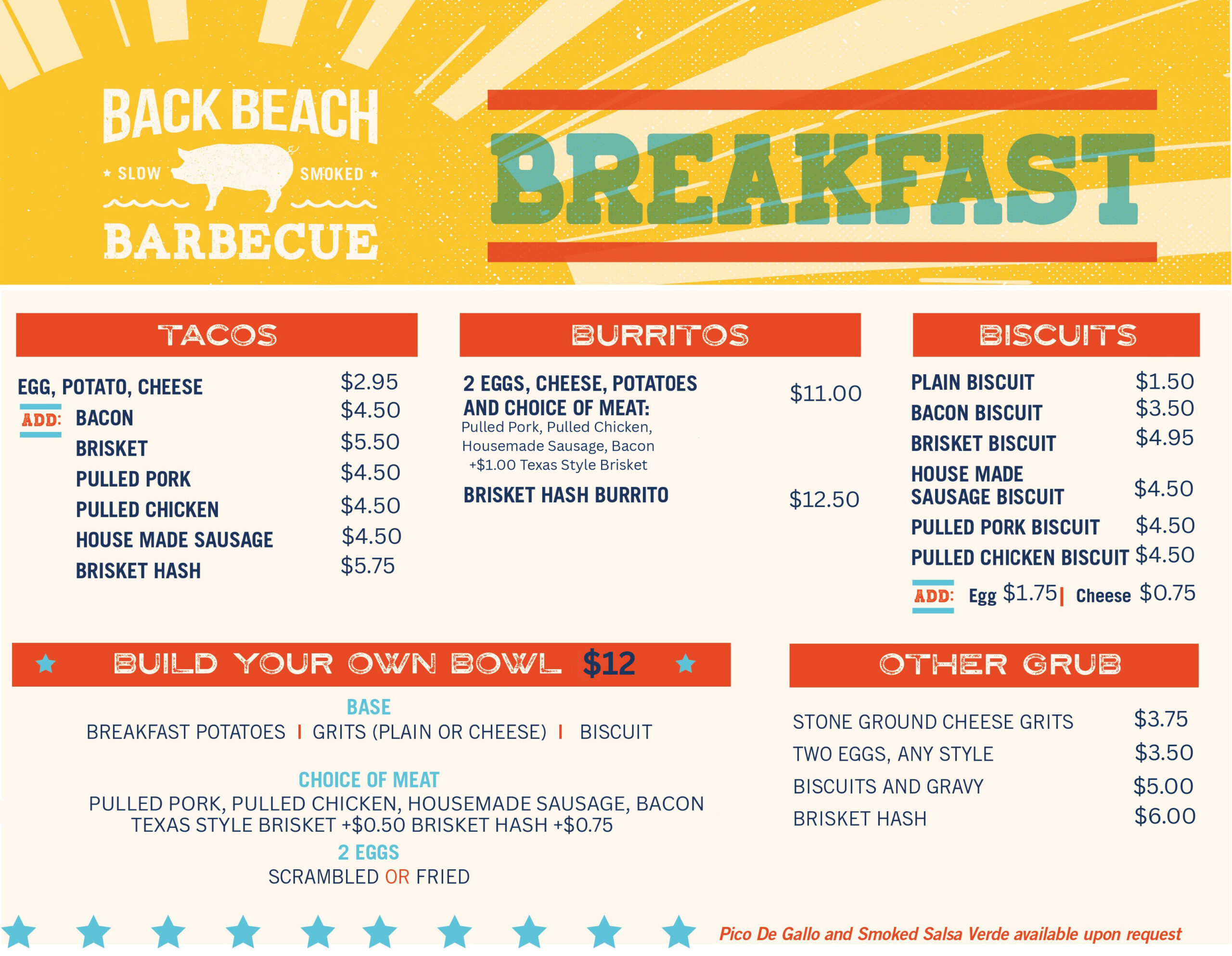 Welcome to the breakfast menu at Back Beach Barbecue in Panama City Beach, where we’ve brought our barbecue expertise to the most important meal of the day! Start your morning right with our mouth-watering selection of breakfast specialties, each with a unique BBQ twist. Our menu features a range of delicious options, including savory breakfast tacos, hearty burritos, and classic breakfast biscuits, all customizable to your liking.